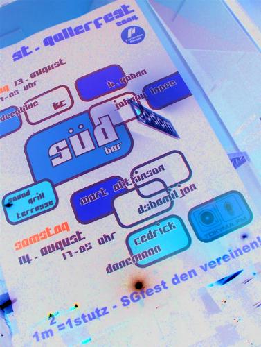 line up friday, 13.08.2004 - djs deepdeepblue, kc, johnny lopez, b.gahan saturday, 14.08.2004 - djs dshamiljan, cédrick, mart attkinson, danemann message 1m2=1stutz - SGfest den vereinen! project by deepdeepblue gfx ddb & tanju san thx to parisienne, süd crew, marcel, copy-art, habegger, david